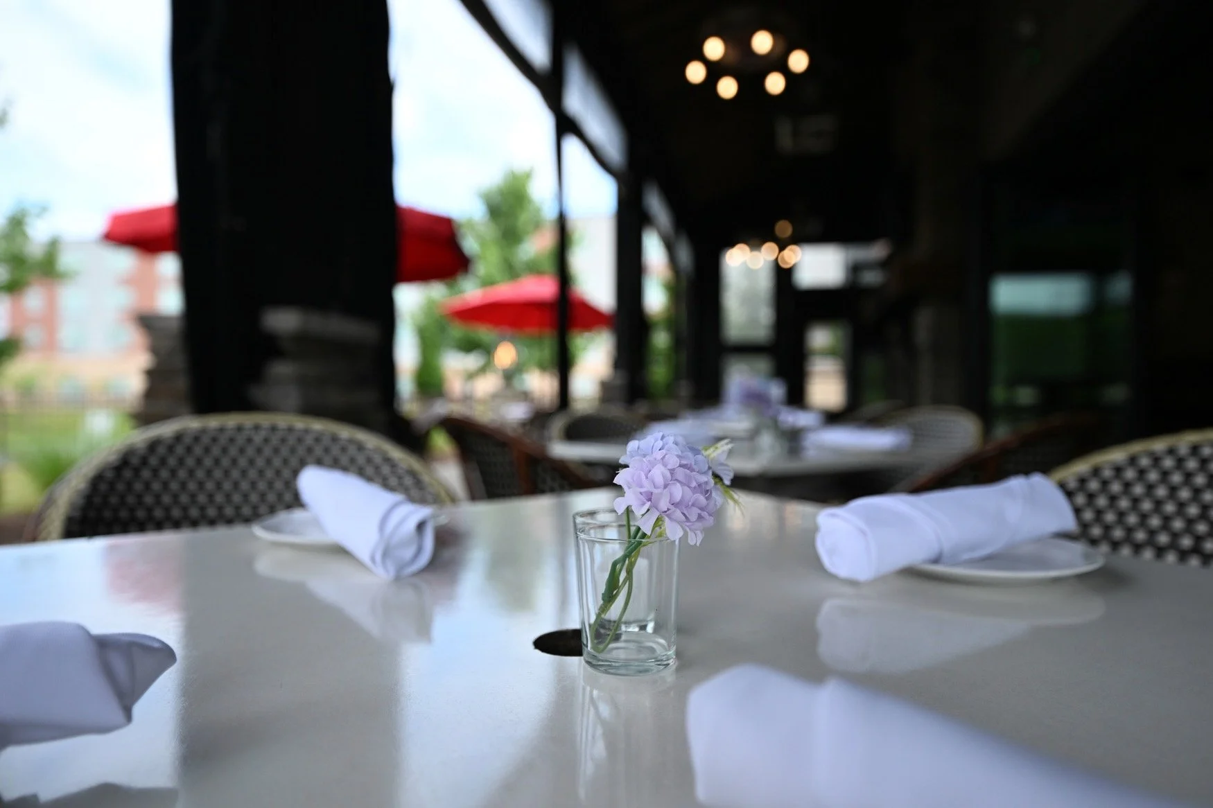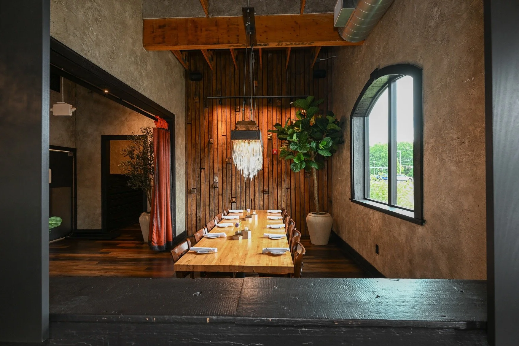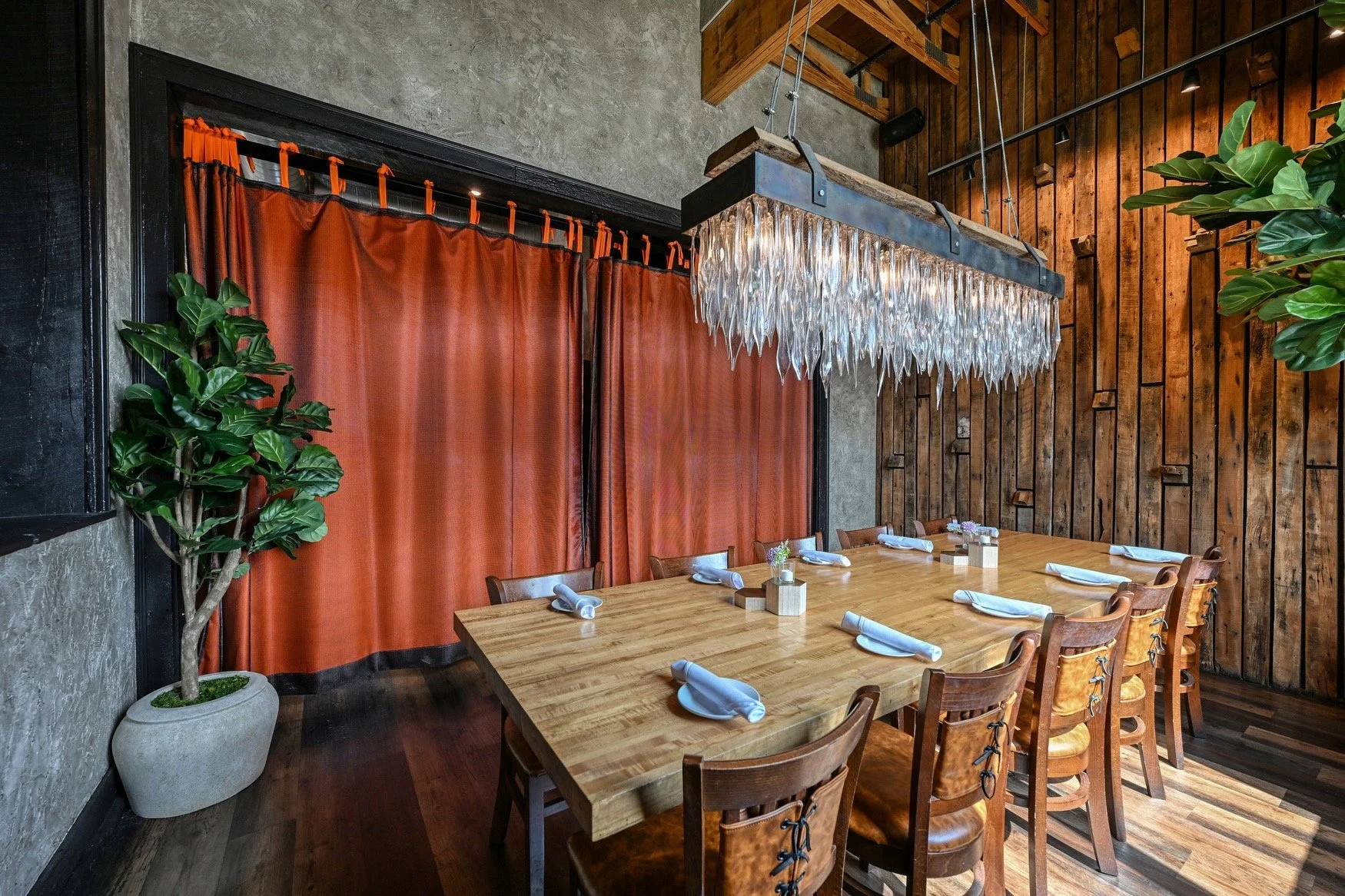 Located just off the main dining room, this spacious setting is framed by wood beams and illuminated by hand-blown glass pendants. The Back Patio accommodates up to 50 guests.