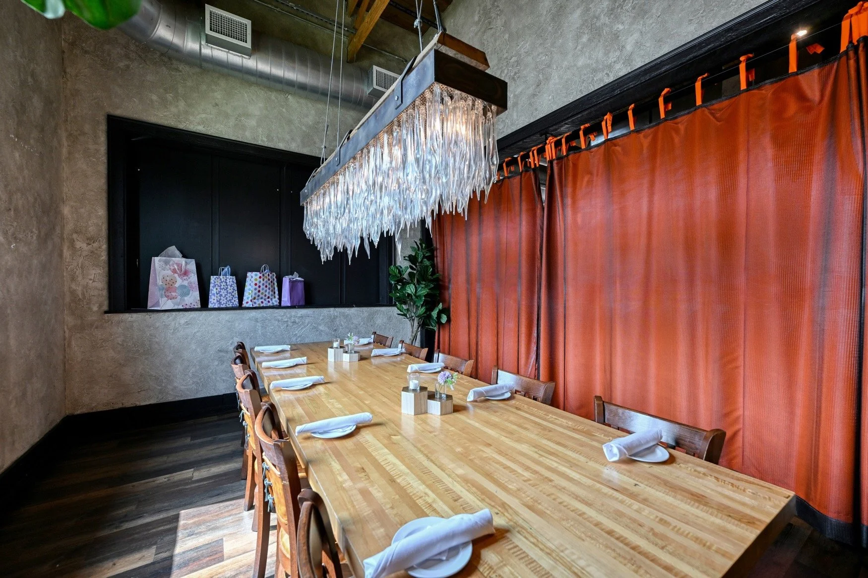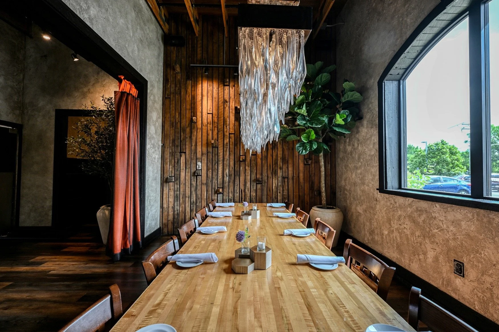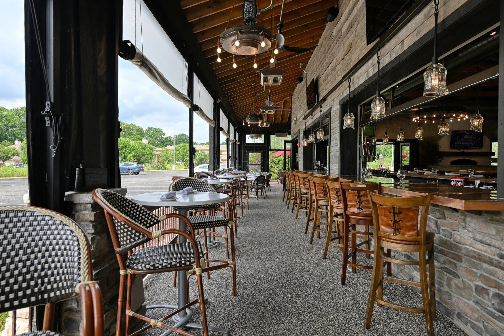 Located just off the main dining room, this spacious setting is framed by wood beams and illuminated by hand-blown glass pendants. The Back Patio accommodates up to 50 guests.