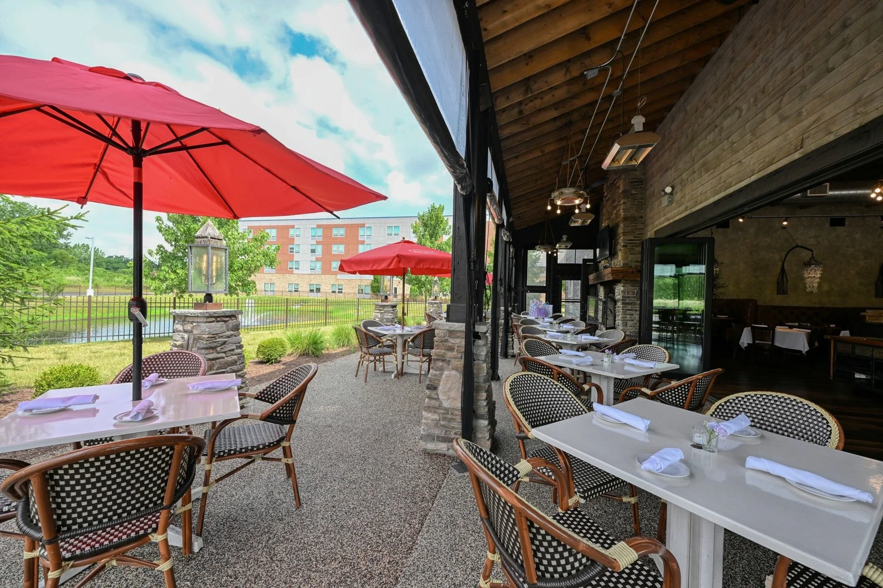 Located just off the main dining room, this spacious setting is framed by wood beams and illuminated by hand-blown glass pendants. The Enclosed Patio accommodates up to 55 guests.