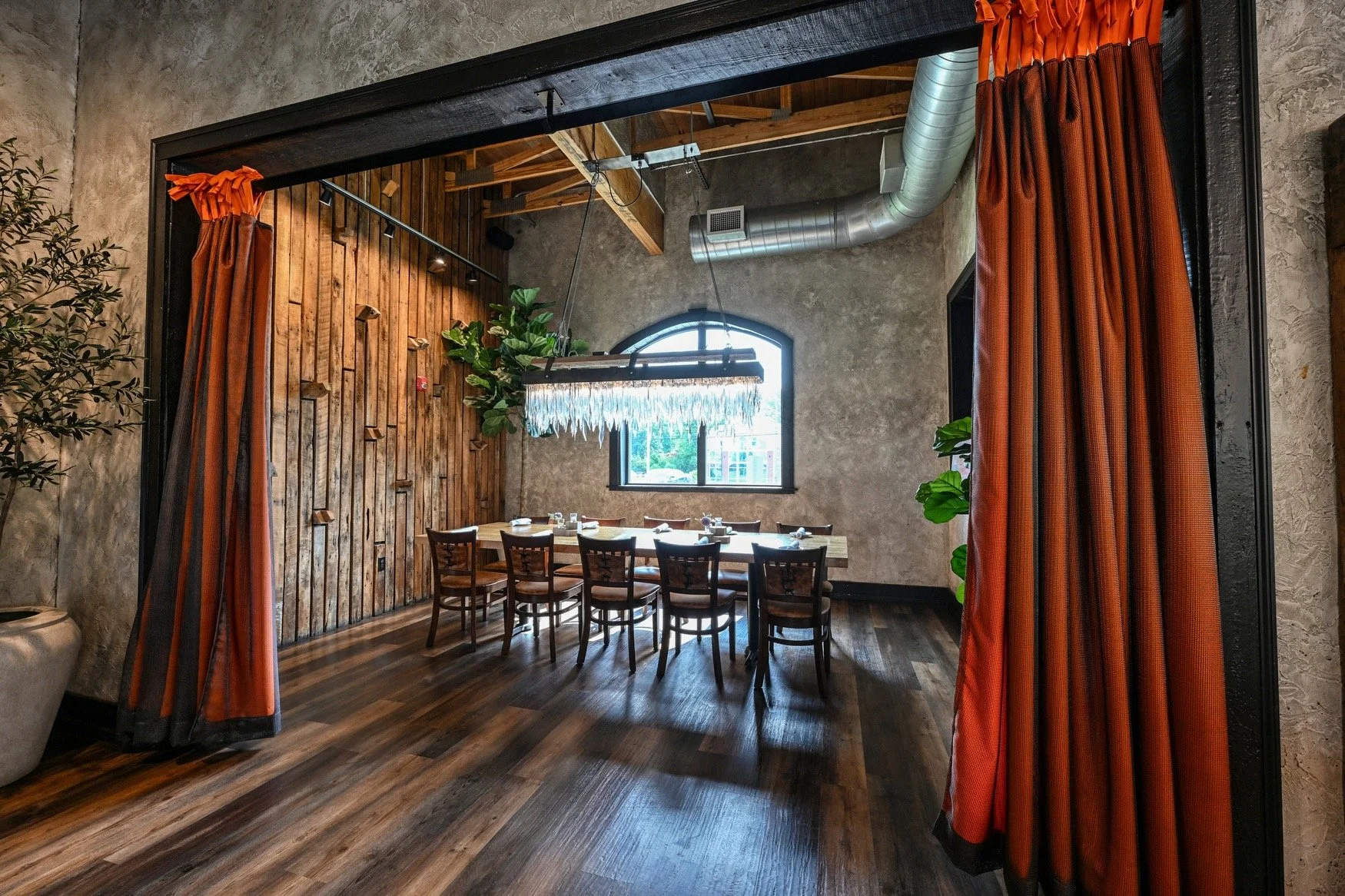 Set beneath wood-beamed ceilings and rustic chandeliers, this intimate space accommodates up to 12 guests for a seated lunch or dinner.